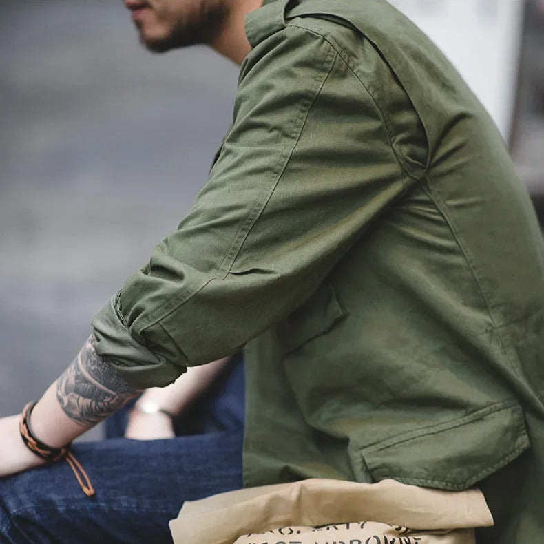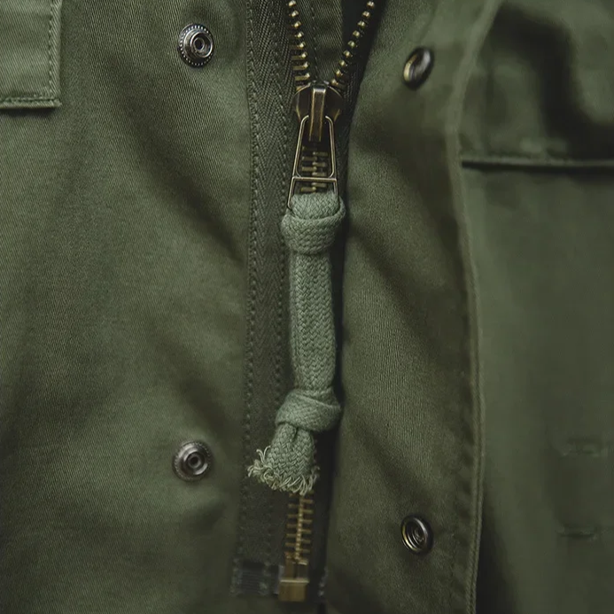 Udvid din garderobe med denne militærjakke med hætte, der er designet til et slidstærkt, men behageligt look. Lynlås og knaplukning foran samt flere lommer sikrer en praktisk og alsidig pasform. Perfekt til krævende udendørsaktiviteter eller afslappet brug.